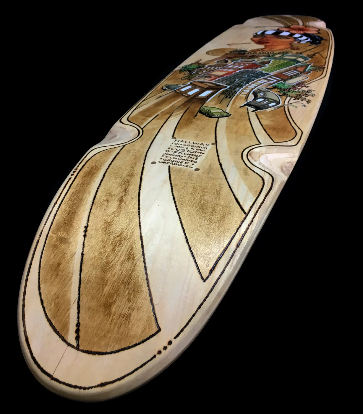 Luke worked in his Colorado shop to handcraft the 41" - 7 ply maple deck - then I added the oil, acrylic, ink, pyrography, and wood stain artwork here in Chicago.